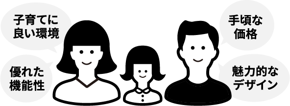 お子様がいるご夫婦の多くは幼稚園や小学校が近くて買い物・通勤に便利な立地を希望されます。